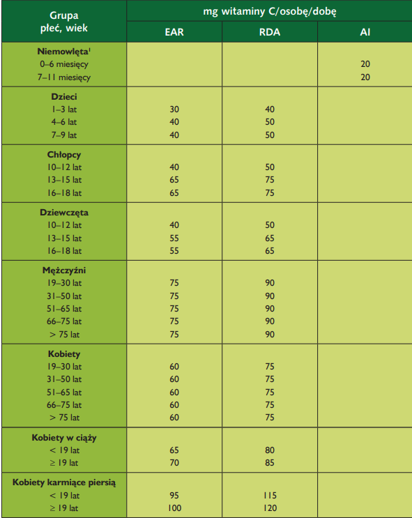 Tab.1 Normy polskie na witaminę C, ustalone na poziomie średniego zapotrzebowania (EAR), zalecanego spożycia (RDA) i wystarczającego spożycia (AI); M. Jarosz, E. Rychlik, K. Stoś, J. Charzewska, Normy żywienia dla populacji Polski i ich zastosowanie, Warszawa 2020