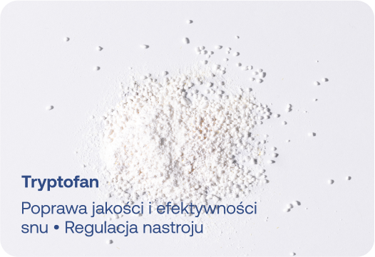 Tryptofan jest prekursorem melatoniny, czyli hormonu regulującego rytm dobowy i promującego sen. Badania pokazały, że składnik ten redukuje czas potrzebny do zaśnięcia, wspiera efektywność snu i skraca czas nocnych przebudzeń. (1)