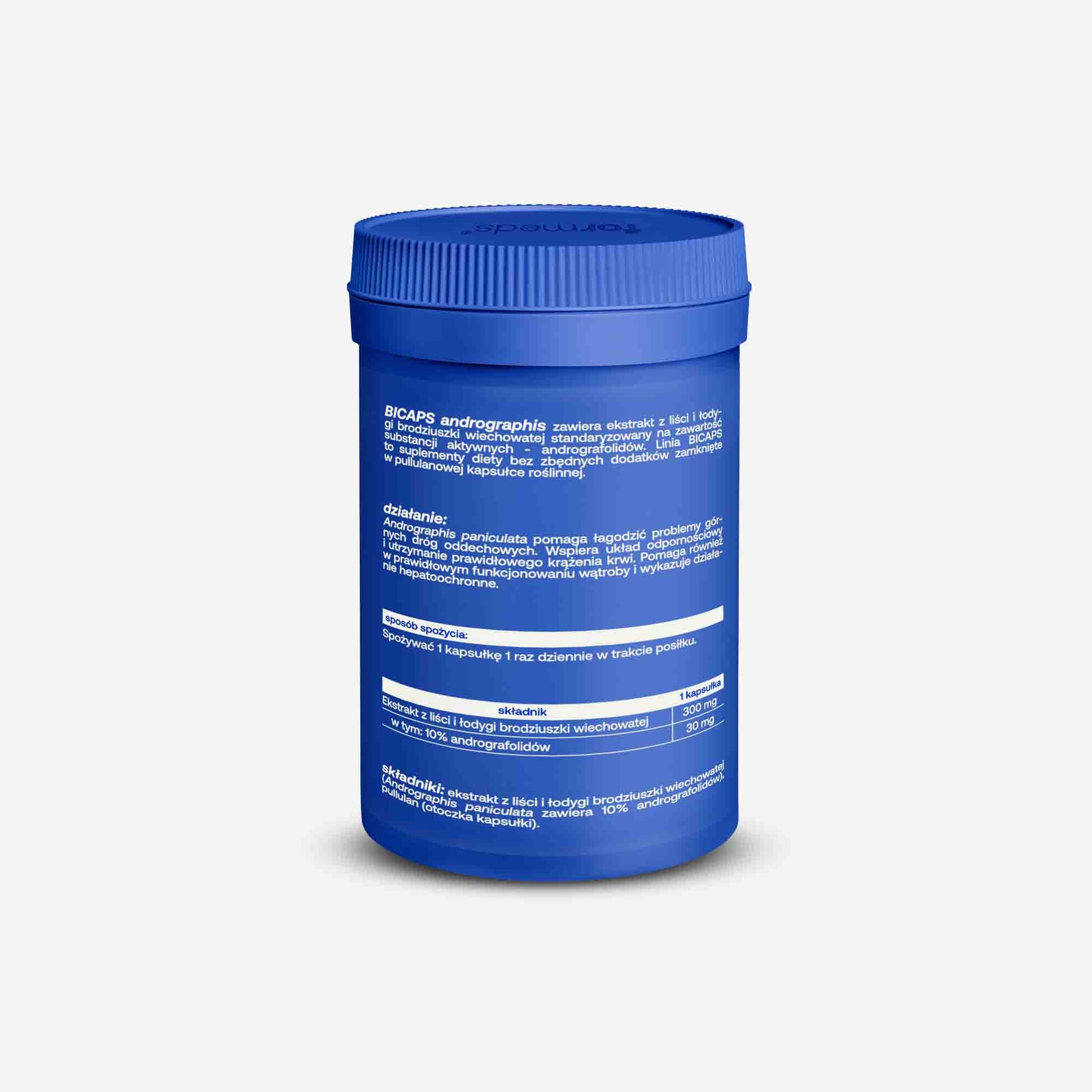 Andrographis Paniculata to roślina, która była tradycyjnie stosowana w indyjskiej i chińskiej medycynie jako naturalny antybiotyk. Używano jej w celu wzmocnienia odporności i leczenia objawów przeziębienia i infekcji górnego układu oddechowego. Jest to jeden z moich ulubionych produktów, który używam jako naturalne, dodatkowe wsparcie organizmu, gdy czuję, że mam obniżoną odporność i pojawiają się pierwsze objawy przeziębieniowe. BICAPS andrographis zawiera ekstrakt z liści łodygi brodziuszki wiechowatej standaryzowany na 10% aktywnej substancji, czyli andrografolidów odpowiedzialnych za dobroczynne właściwości tej rośliny.