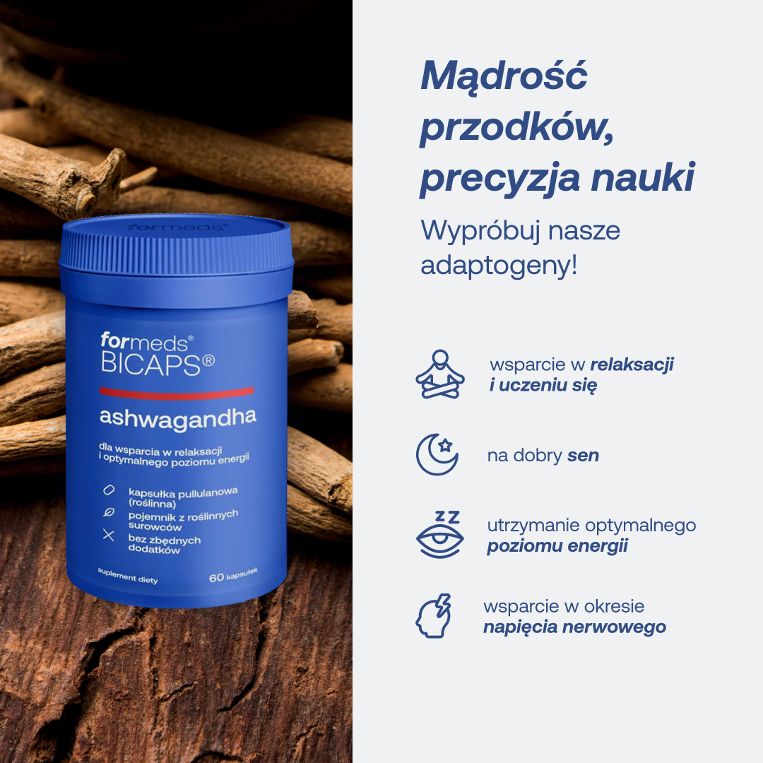 Na rynku występuje zarówno ashwagandha w tabletkach jak i ashwagandha w kapsułkach. Wybór powinien zależeć od preferencji, ale na pewno warto zwrócić uwagę na skład produktu oraz jego standaryzację. Najlepiej wybierać suplementy bez zbędnych dodatków, zazwyczaj w przypadku tabletek zastosowane są zbędne dodatki takie jak przeziwzbrylacze, czy substancje poślizgowe takie jak stearynian magnezu. W przypadku produktu BICAPS ashwagandha użyta została kapsułka pullulanowa – jest to roślinna kapsułka, która odpowiada na potrzeby osób szukających produktów z dobrym składem, bez dodatków.