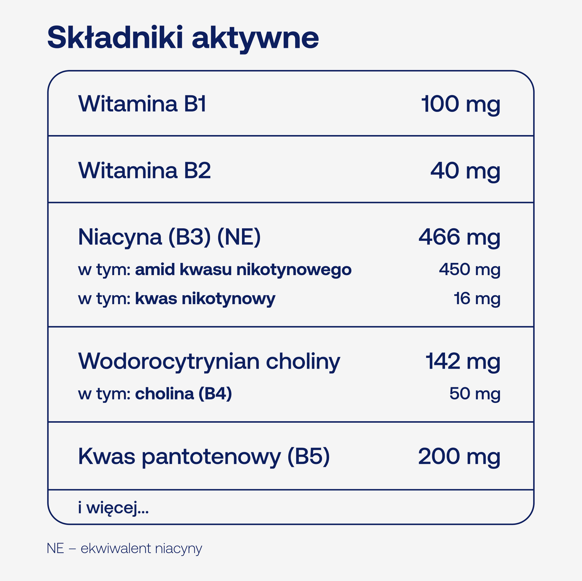 Witaminy B1, B6 i B12 biorą udział w przewodnictwie nerwowym i w syntezie neuroprzekaźników, takich jak dopamina i serotonina. Biotyna i cholina wspierają przemiany metaboliczne w komórkach nerwowych. Foliany są istotne dla regeneracji układu nerwowego oraz wspierają funkcje psychologiczne. Właściwe spożycie tych składników może wspierać funkcjonowanie układu nerwowego, zwłaszcza w okresach zwiększonego obciążenia psychicznego.