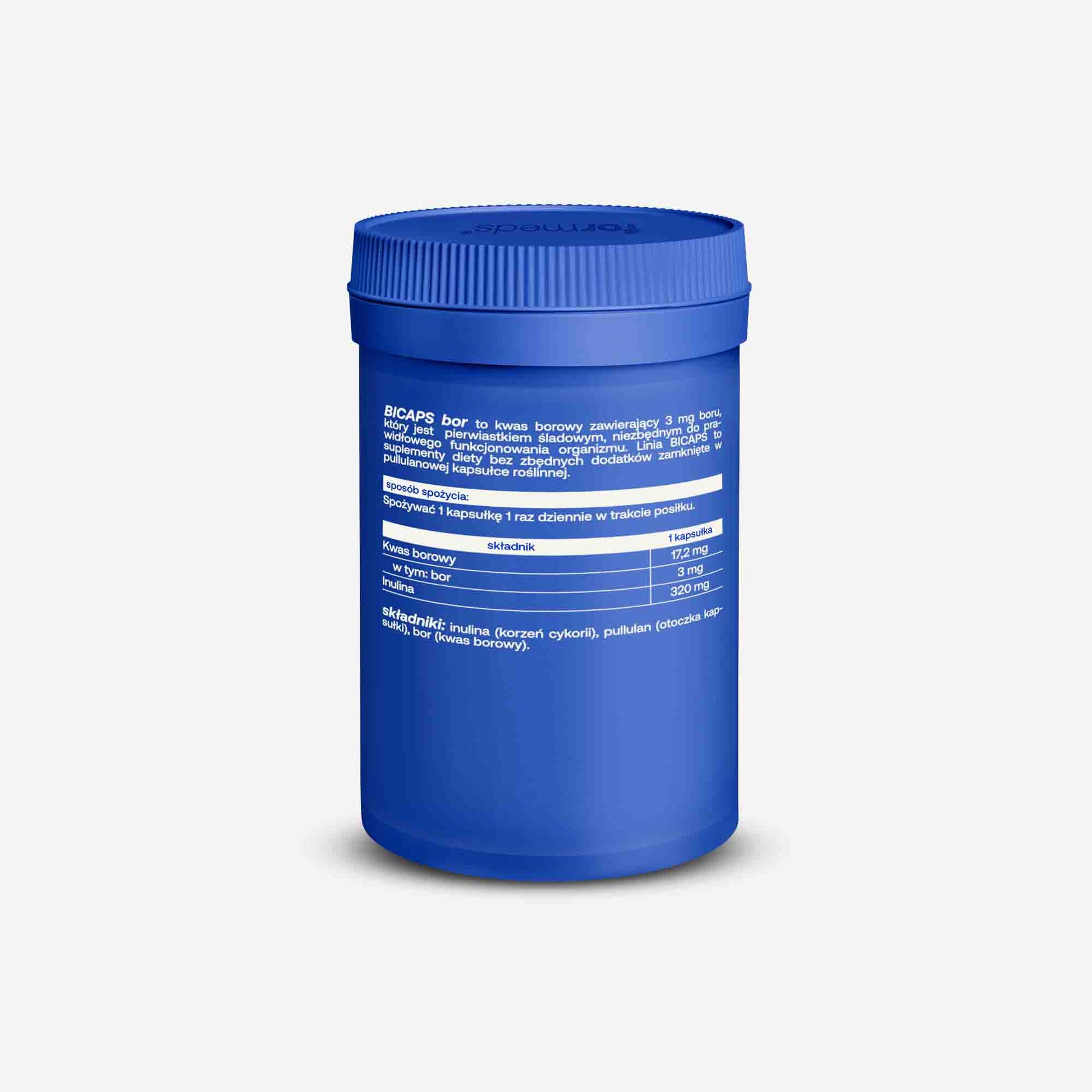 Bor to pierwiastek śladowy, czyli składnik mineralny, którego organizm potrzebuje w niewielkich ilościach, ale odgrywający ważną rolę w wielu funkcjach biologicznych, w tym w metabolizmie wapnia i witaminy D oraz utrzymaniu zdrowych kości. Niedobór boru może pojawić się przede wszystkim u osób z niewłaściwie zbilansowaną dietą, ubogą w warzywa i owoce, które są jego głównym źródłem. Według badań skuteczną dawką boru potrzebną do utrzymania zdrowych kości jest suplementacja 3 mg tego składnika dzienne. W produkcie BICAPS bor znajdziemy dobrze przyswajalny kwas borowy standaryzowany właśnie na 3 mg samego boru w porcji dziennej.