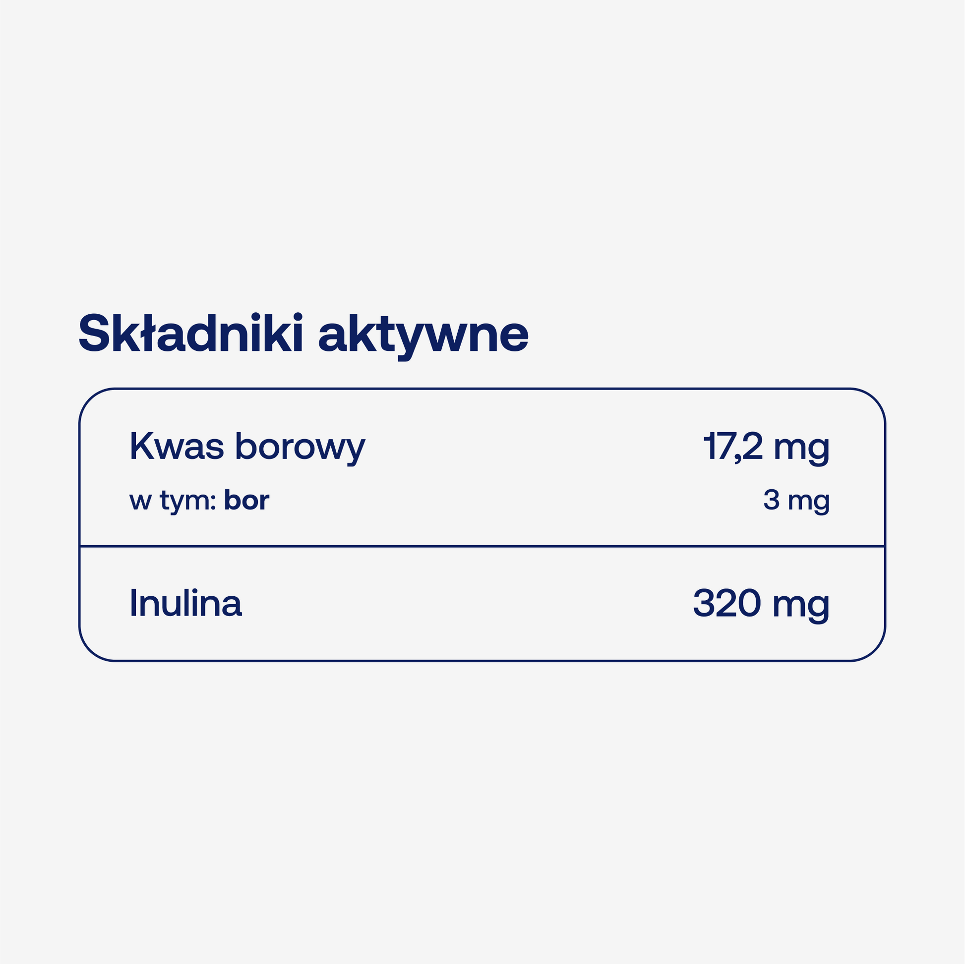 Składniki: inulina (korzeń cykorii), pullulan (otoczka kapsułki), bor (kwas borowy).