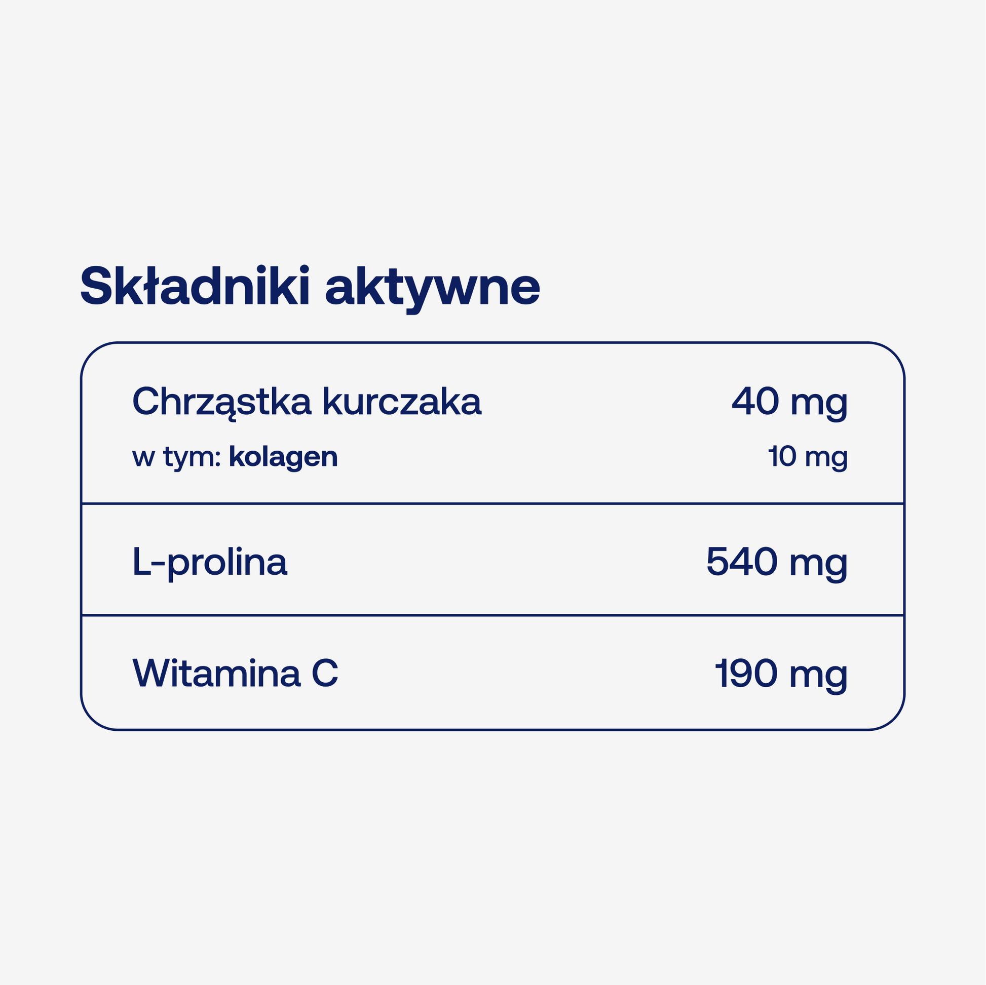 Składniki: L-prolina, witamina C (kwas L-askorbinowy), pullulan (otoczka kapsułki), kolagen (chrząstka kurczaka).