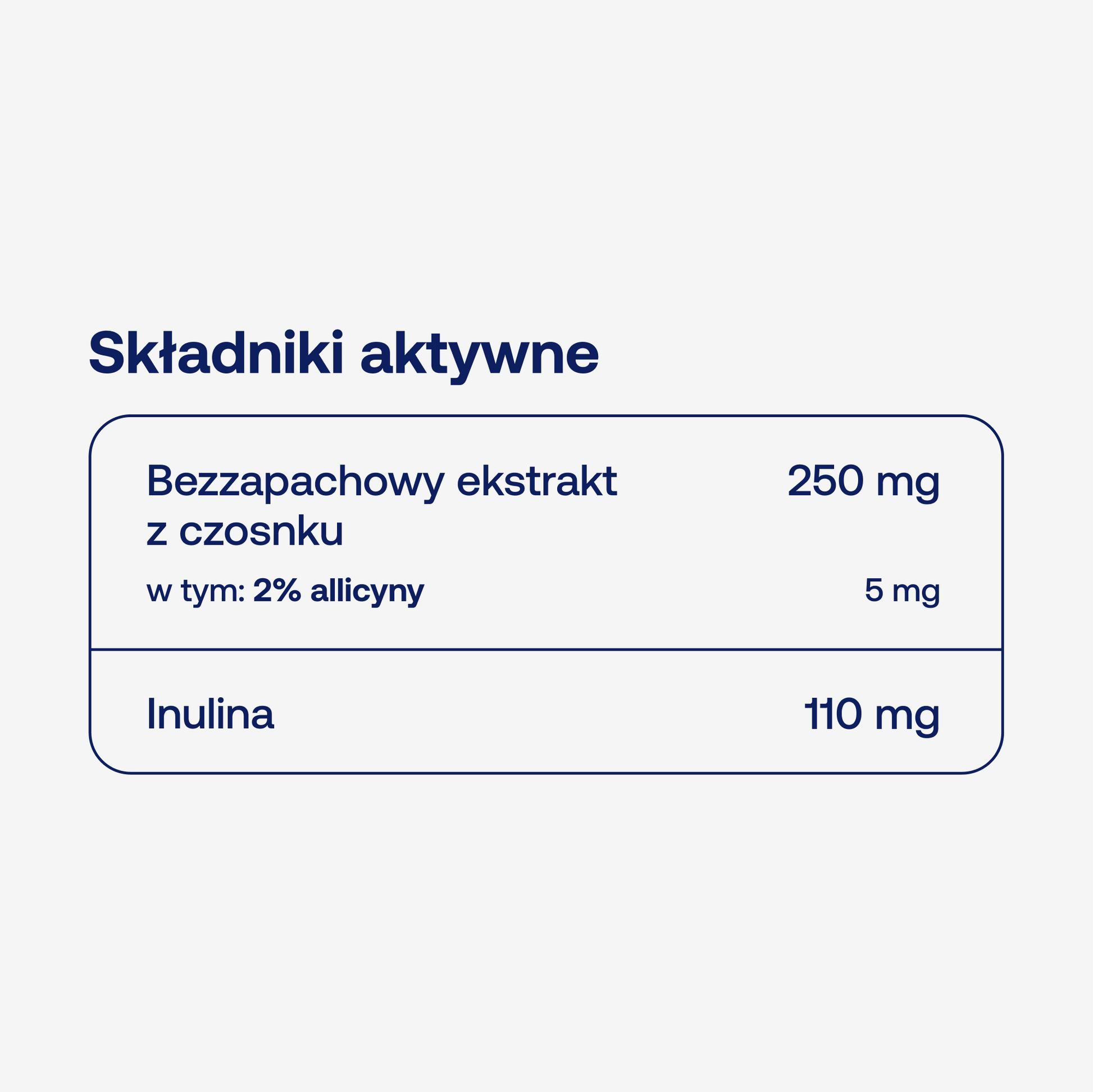 Składniki: ekstrakt z czosnku pospolitego (Allium sativum L.), inulina (korzeń cykorii), pullulan (otoczka kapsułki).