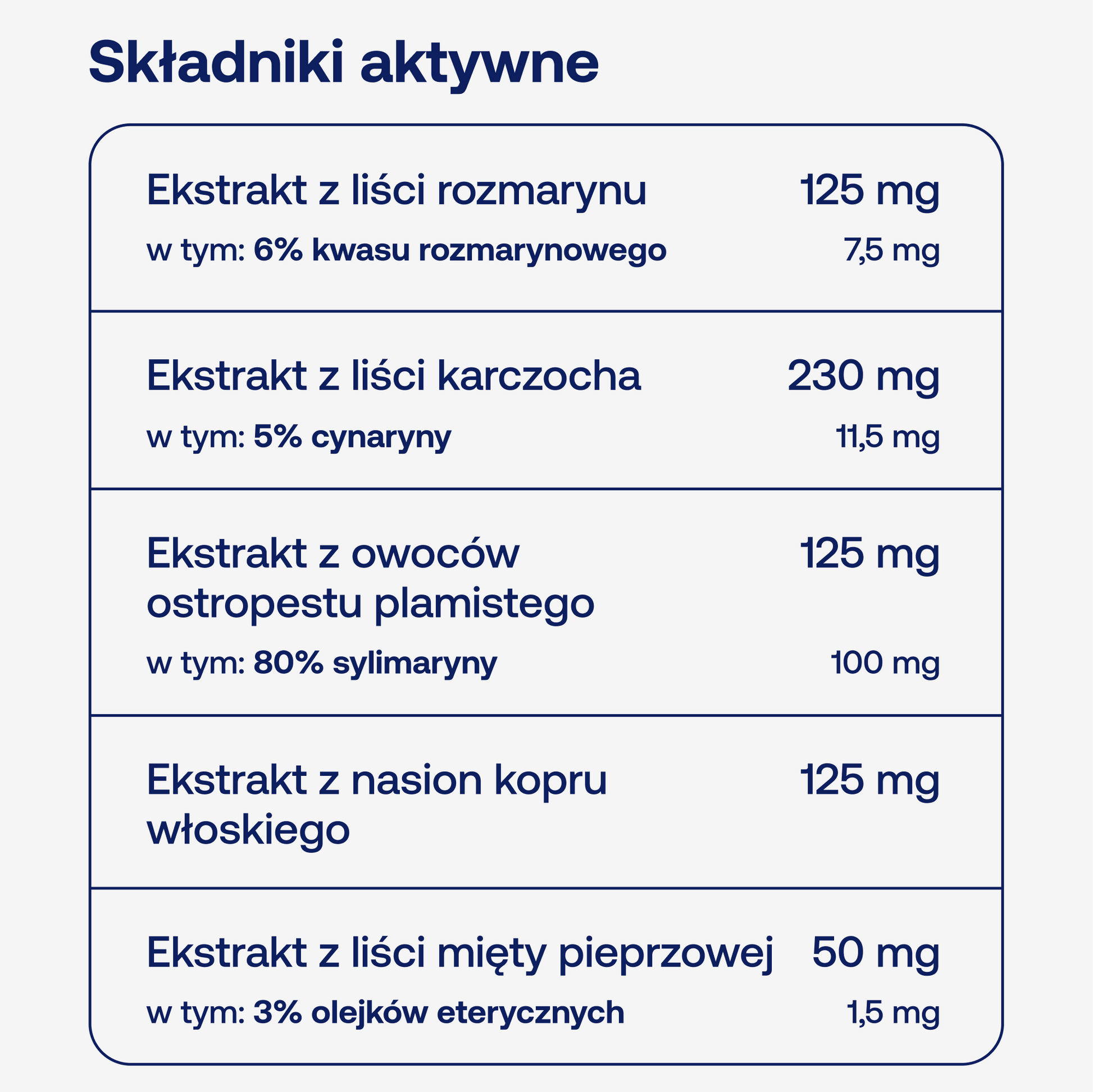 Składniki: ekstrakt z liści karczocha (Cynara scolymus L.), pullulan (otoczka kapsułki), ekstrakt z owoców ostropestu plamistego (Silybum marianum L.), ekstrakt z liści rozmarynu (Rosmarinus officinalis L.), ekstrakt z nasion kopru włoskiego (Foeniculum vulgare), ekstrakt z mięty pieprzowej (Mentha piperita L.).