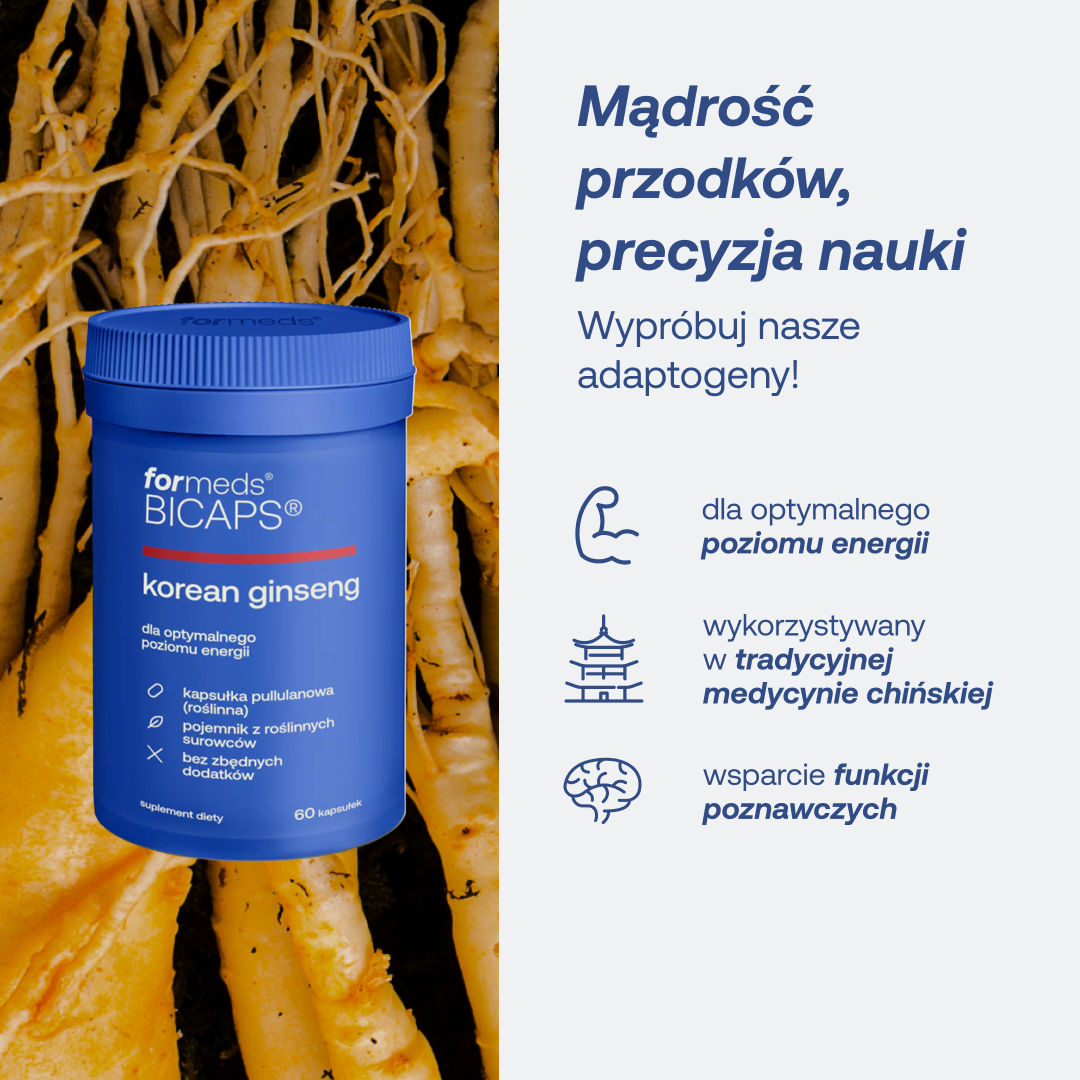 Korzeń żeń-szenia, ze względu na swoją wszechstronność, jest stosowany w tradycyjnej medycynie Azji Wschodniej (Korei i Chinach) od tysięcy lat. Wśród kilku gatunków żeń-szenia, odmiana koreańska zazwyczaj stosowana jest w tzw. medycynie regeneracyjnej – czyli przywracania utraconych funkcji organizmu w procesie starzenia się. Głównymi aktywnymi składnikami żeń-szenia koreańskiego są ginsenozydy, których odpowiednią ilość dostarczy nam suplement BICAPS korean ginseng. Wyniki badań klinicznych pokazują, że żeń-szeń może również poprawić funkcje psychologiczne, funkcje odpornościowe oraz poziom glukozy. Generalnie, żeń-szeń koreański wydaje się być dobrze tolerowany, chociaż zaleca się ostrożność podczas jednoczesnego stosowania z niektórymi lekami, np. insuliną.
