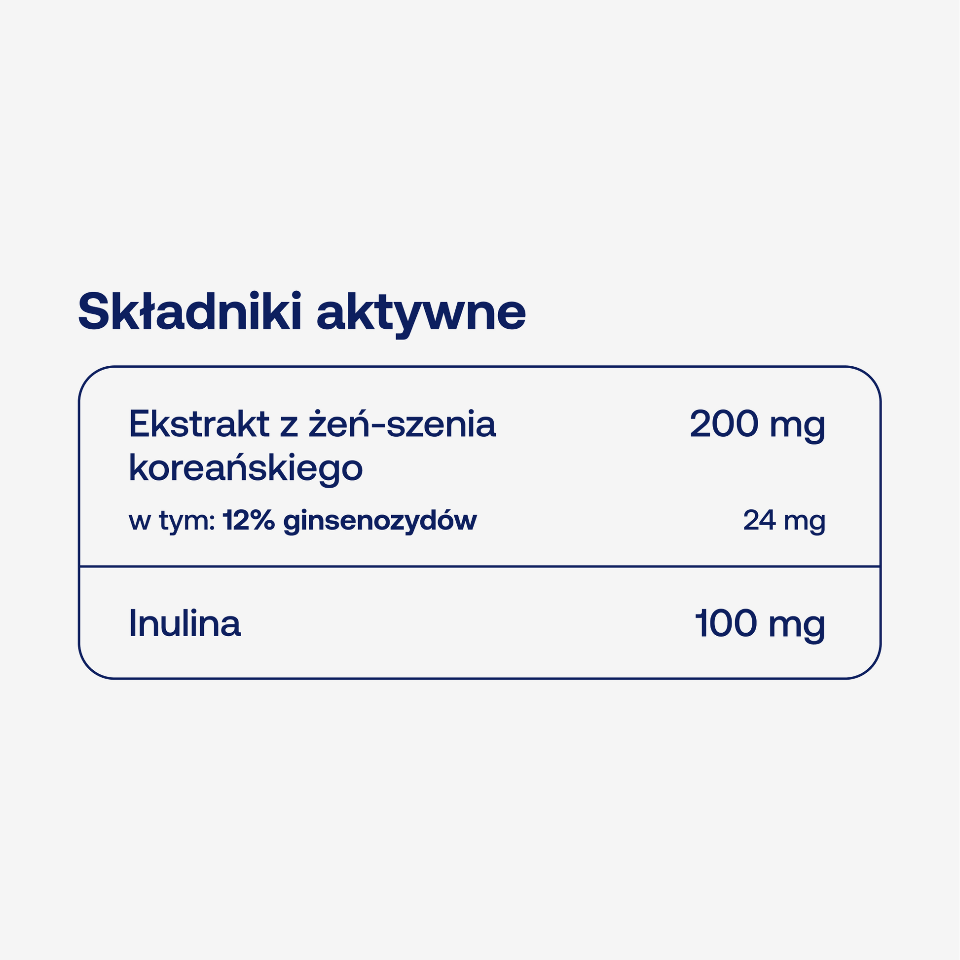 Składniki: ekstrakt z żeń-szenia koreańskiego (Araliaceae Panax ginseng C.A. Mey zawiera 12% ginsenozydów), inulina (korzeń cykorii), pullulan (otoczka kapsułki).