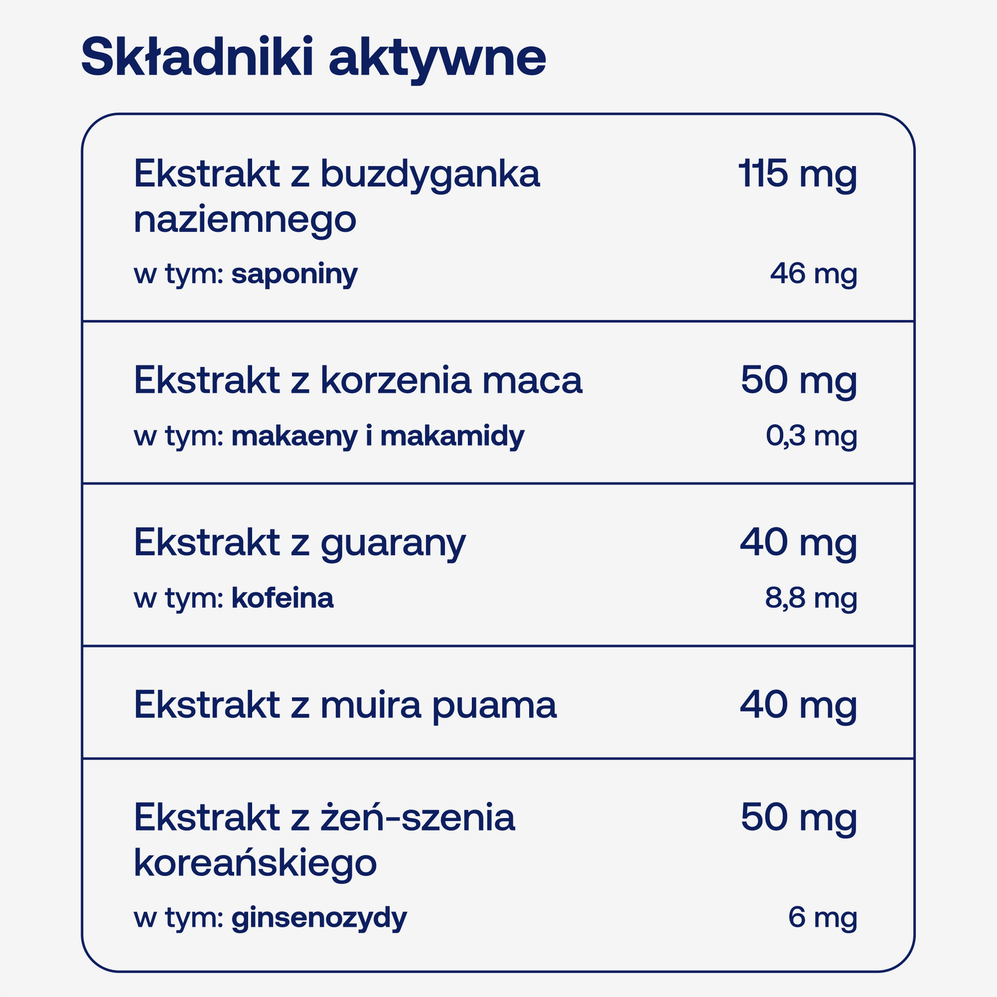 Składniki: ekstrakt z buzdyganka naziemnego (Tribulus terrestris L.), pullulan (otoczka kapsułki), ekstrakt z korzenia maca (Lepidium meyenii), ekstrakt z żeń-szenia koreańskiego (Araliaceae Panax ginseng C.A. Mey), ekstrakt z guarany (Sapindaceae Paullinia cupana Kunth), ekstrakt z muira puama (Olacaeae Ptychopetalum olacoides Benth)