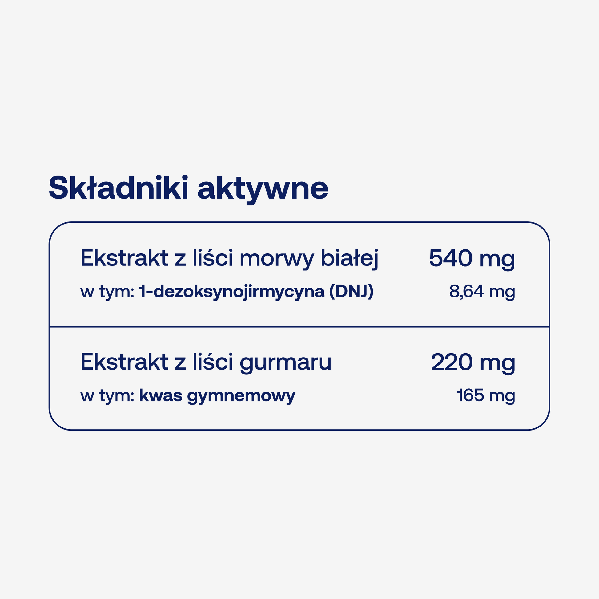 Połączenie ekstraktu z liści morwy białej standaryzowanej na 1-dezoksynojirmycynę (DNJ) oraz ekstrakt z liści gurmaru standaryzowany na kwas gymnemowy.