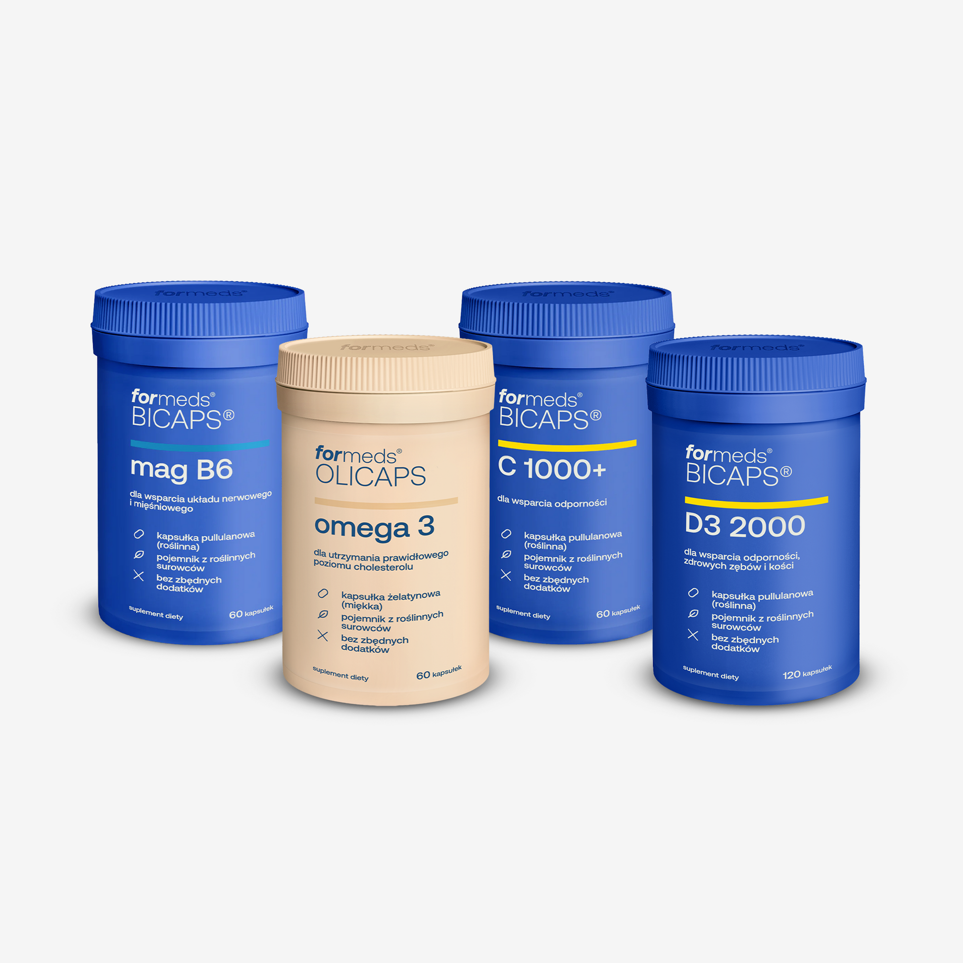 Zestaw 4 suplementów: BICAPS mag B6, OLICAPS omega-3, BICAPS C 1000+ i BICAPS D3 2000, opracowany z myślą o codziennym wsparciu organizmu w kluczowych obszarach – energii, odporności, pracy mięśni i układu nerwowego.
