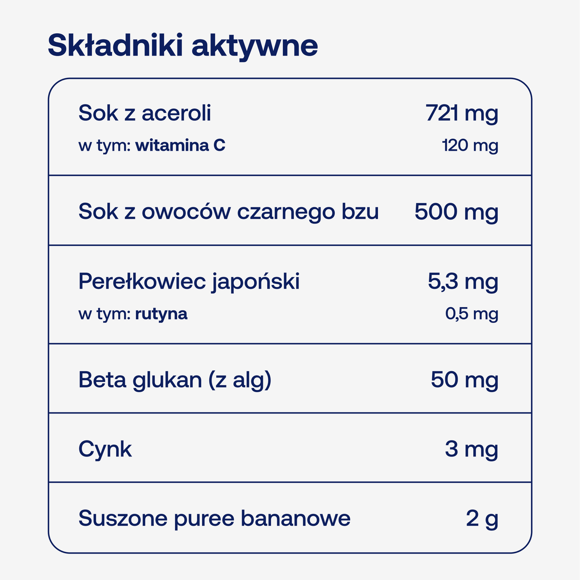Kompleksowy suplement dla dzieci od 3. roku życia, zawierający suszony sok z aceroli jako źródło witaminy C, sok z owoców czarnego bzu oraz ekstrakt z perełkowca japońskiego standaryzowany na rutynę. Formułę wzbogacono o beta glukan pochodzenia algowego oraz cynk w formie wysoko przyswajalnego cytrynianu.