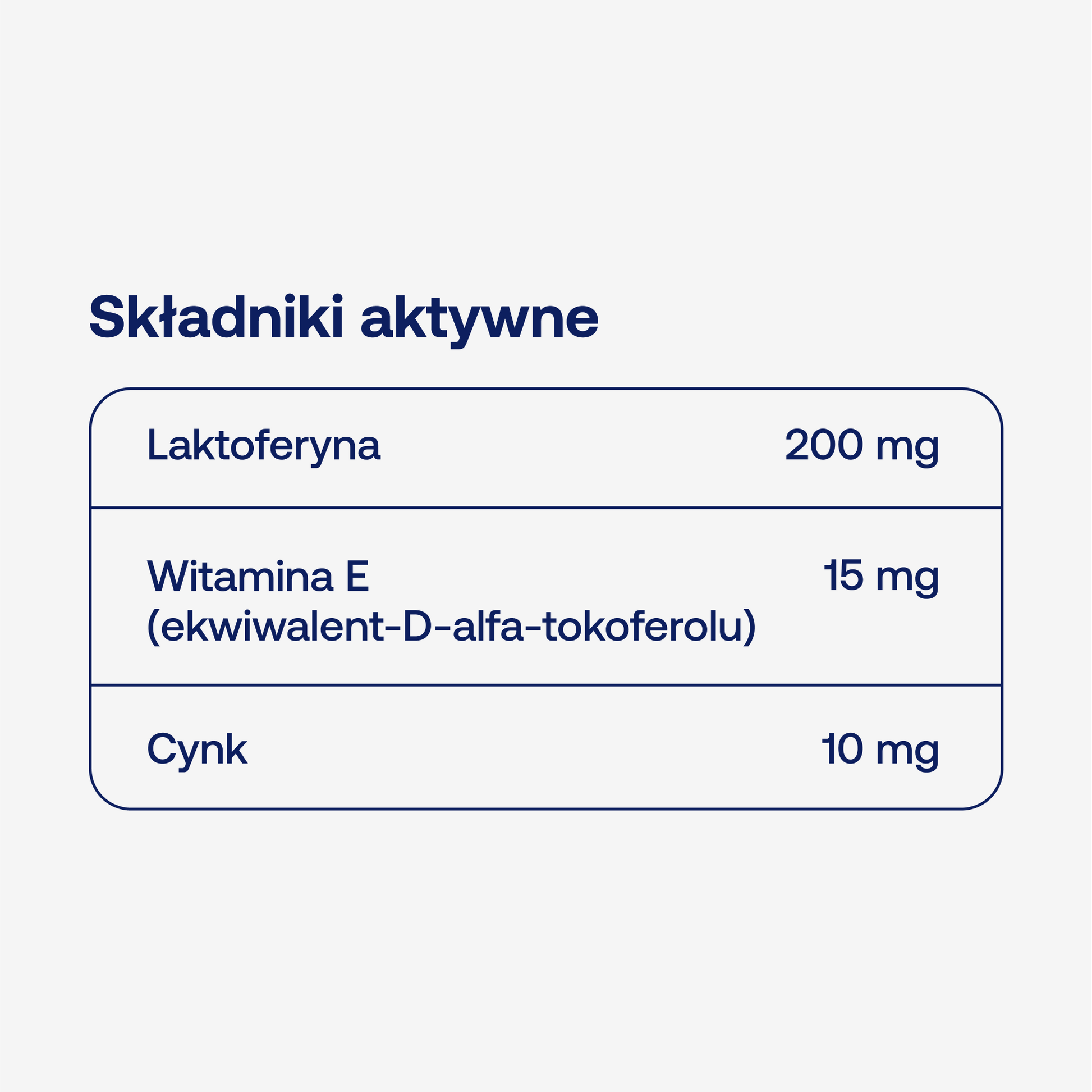 Składniki: laktoferyna, pullulan (otoczka kapsułki), cynk (cytrynian cynku), witamina E (bursztynian D-alfa-tokoferylu).