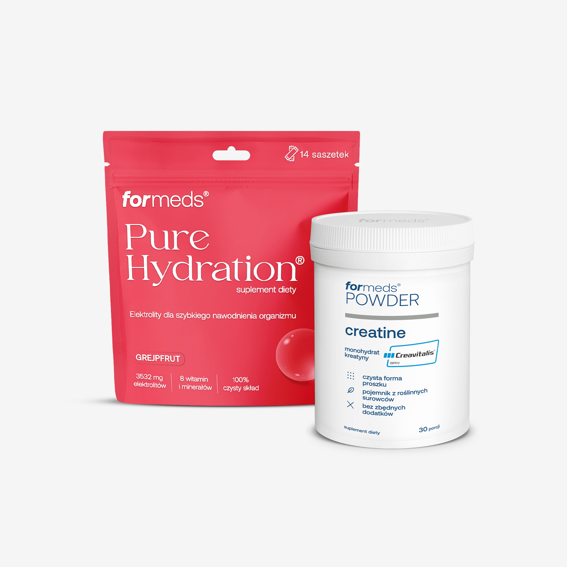 Zestaw 2 produktów: POWDER creatine i Pure Hydration Grejpfrut, opracowany z myślą o codziennym wsparciu organizmu przy intensywnym trybie życia - dla utrzymania sprawnych mięśni, prawidłowego nawodnienia i zwiększenia wytrzymałości podczas aktywności fizycznej.