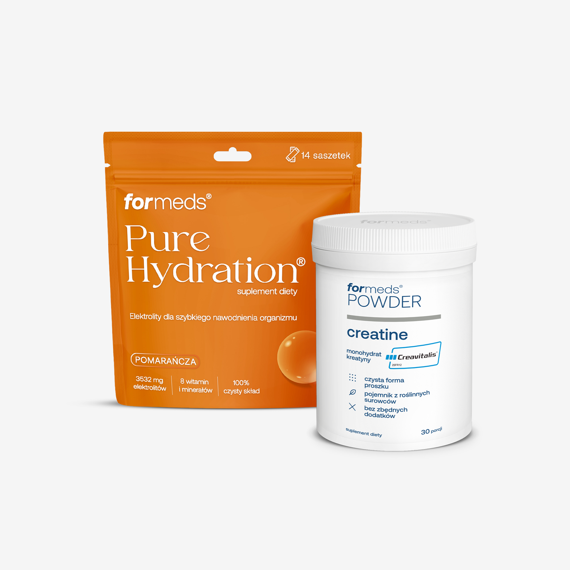 Zestaw 2 produktów: POWDER creatine i Pure Hydration Pomarańcza, opracowany z myślą o codziennym wsparciu organizmu przy intensywnym trybie życia - dla utrzymania sprawnych mięśni, prawidłowego nawodnienia i zwiększenia wytrzymałości podczas aktywności fizycznej.