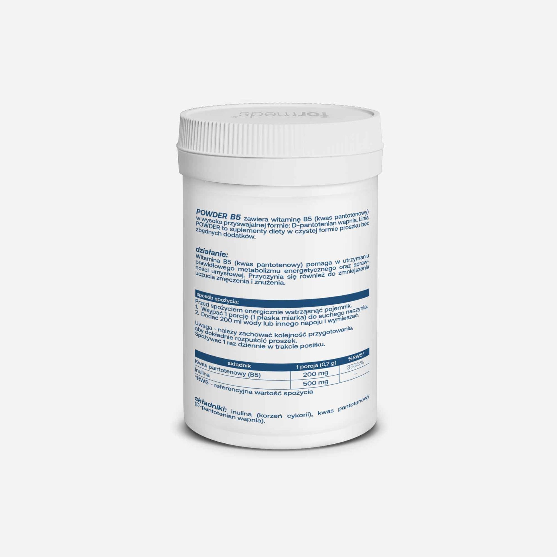 Witamina B5, inaczej kwas pantotenowy, zmniejsza uczucie zmęczenia i znużenia, wspomaga utrzymanie sprawności umysłowej oraz korzystnie wpływa na naszą skórę i włosy. Niedobór kwasu pantotenowego może pojawić się u osób niedożywionych. POWDER B5 zawiera bardzo dobrze przyswajalną formę D-pantotenianu wapnia w formie proszku, dzięki czemu suplement można dosypać np. do porannego, ulubionego koktajlu, a doda nam wtedy energii na cały dzień.