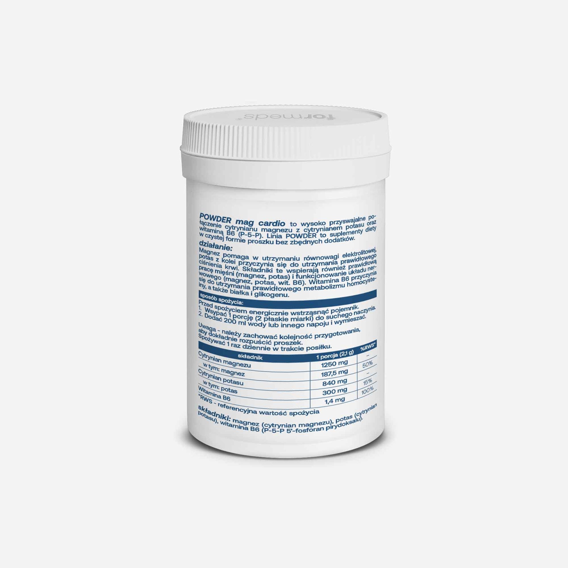 Składniki: magnez (cytrynian magnezu), potas (cytrynian potasu), witamina B6 (P-5-P 5'-fosforan pirydoksalu).