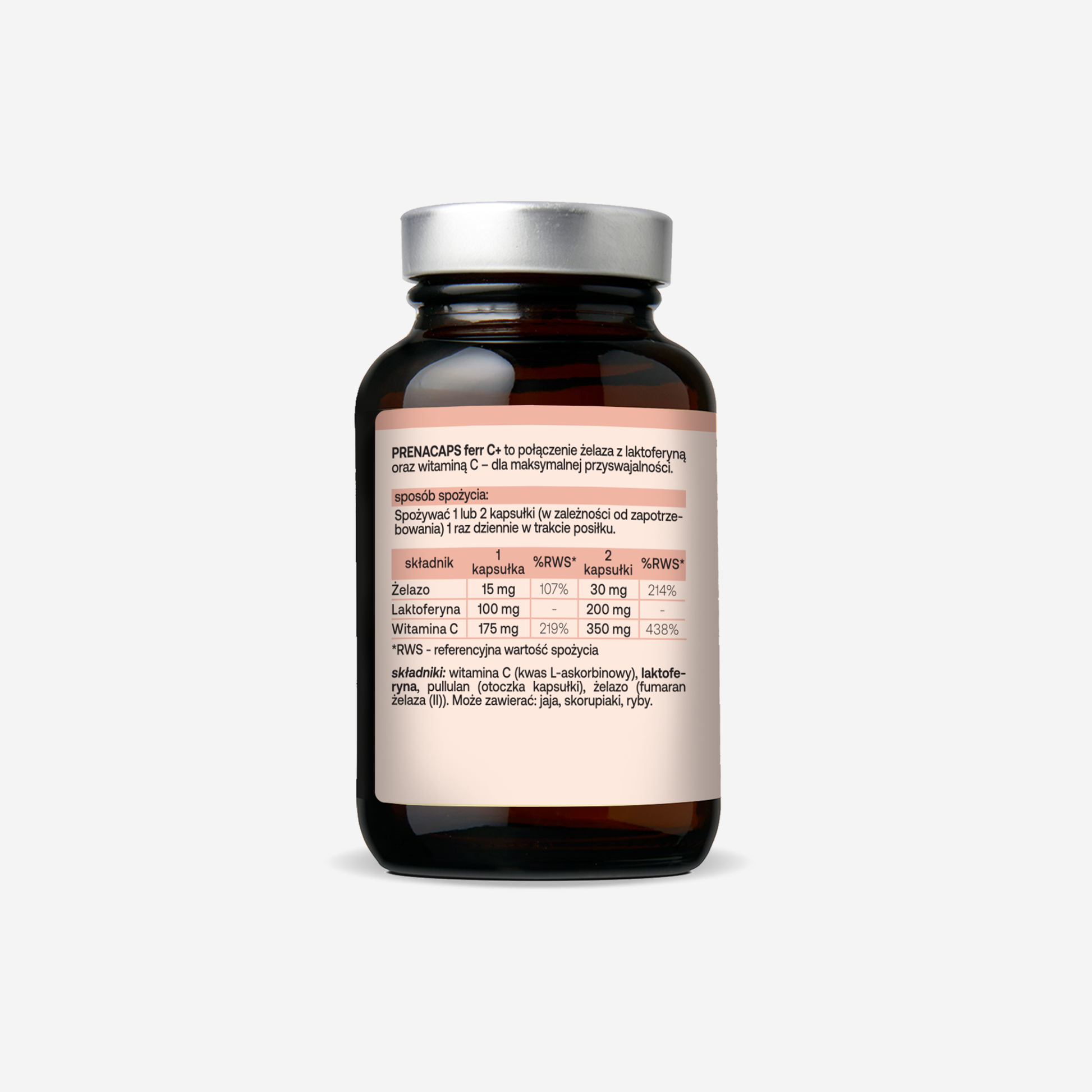 PRENACAPS ferr C+ to wysoko przyswajalna forma żelaza, polecana dla kobiet w ciąży i karmiących. Forma fumaranu żelaza, zastosowana w preparacie, nie powoduje nieprzyjemnych objawów ze strony układu pokarmowego, a dodatek laktoferyny oraz witaminy C może zwiększać jego przyswajanie.