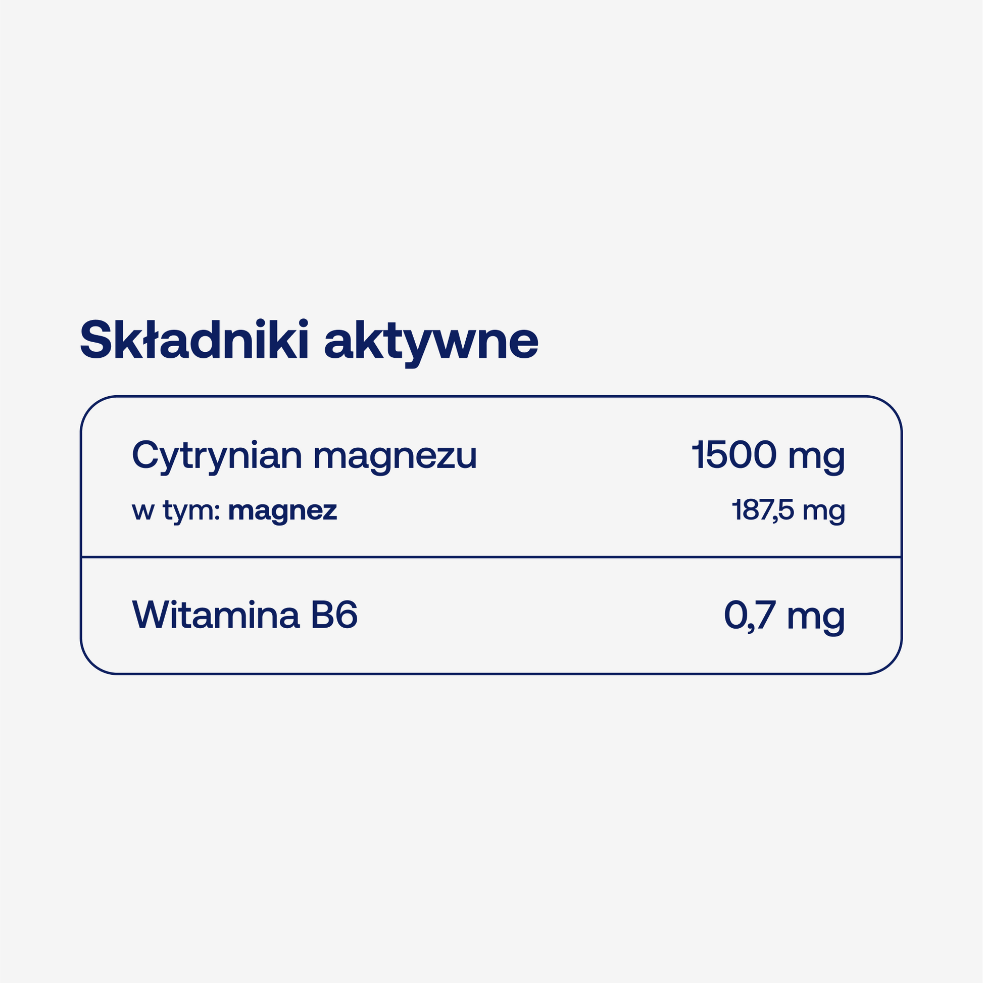 Składniki: magnez (cytrynian magnezu), pullulan (otoczka kapsułki), witamina B6 (5'-fosforan pirydoksalu).