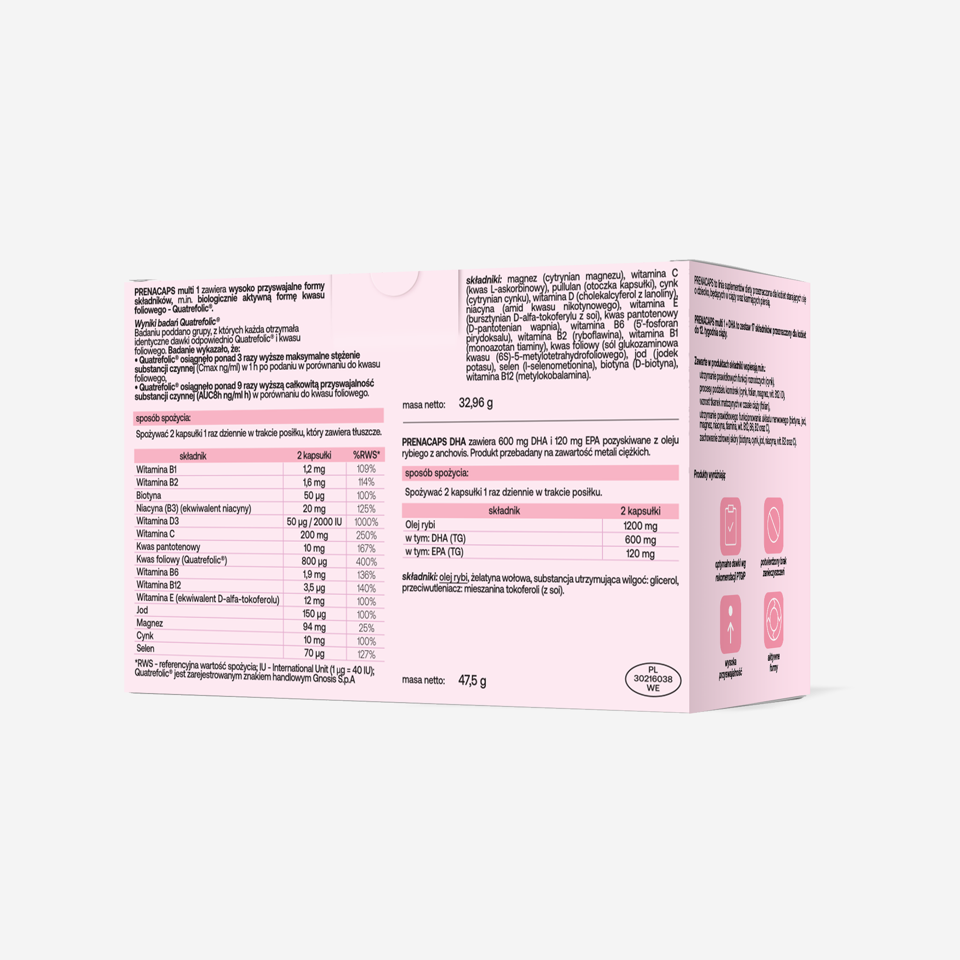 PRENACAPS multi 1 + DHA zapewnia dzienne zapotrzebowanie m.in. na kwas foliowy, witaminę D3, jod oraz kwasy DHA. Warto, aby jego suplementacja była wdrożona od początku ciąży i była kontynuowana do 12. tygodnia ciąży.