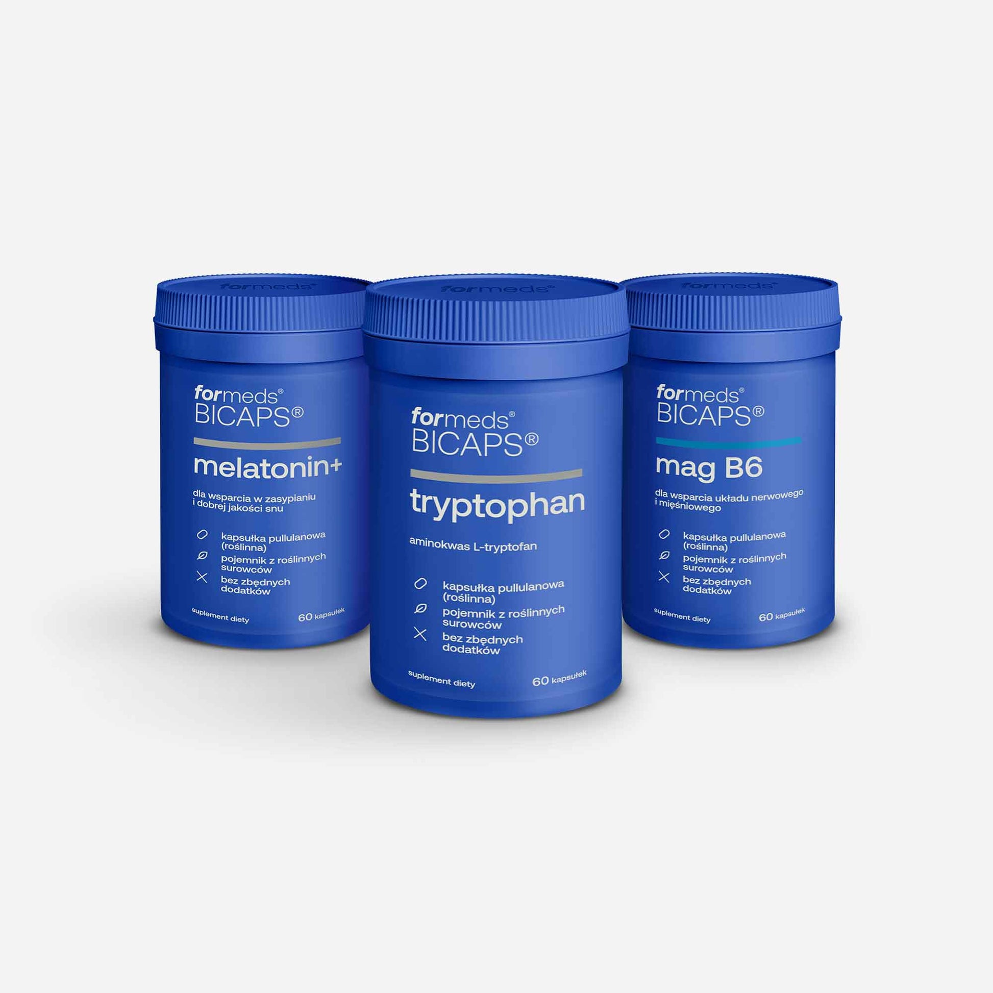 Zestaw 3 suplementów firmy Formeds zadba o to, aby Twój sen był efektywny, spokojny i głęboki. Melatonina, która naturalnie reguluje nasz rytm dobowy, często niestety jest zaburzona przez nieregularne pory snu oraz ekspozycję na światło niebieskie w godzinach wieczornych. BICAPS melatonin+ ułatwi nam zaśnięcie i pomoże uregulować sen. Tryptofan zadba o prawidłowe fazy naszego snu, jego jakość i długość. Jego obecność jest również niezbędna do powstania melatoniny, zatem działanie tych dwóch składników można uznać za synergiczne. Kolejnym efektem będzie nasze lepsze samopoczucie, ponieważ tryptofan jest prekursorem ‘hormonu szczęścia’ – serotoniny. Dopełnieniem zestawu jest BICAPS mag B6, zawierający magnez w jednej z najlepiej przyswajalnych form czyli cytrynianu, z dodatkiem witaminy B6, która dodatkowo potęguje wchłanianie komórkowe nawet o 40%. Magnez normalizuje niepożądane zmiany w rytmie snu. Jedno z badań wykazało, że magnez niweluje skutki zespołu niespokojnych nóg, symptomy którego najczęściej występują w nocy, zaburzając sen.