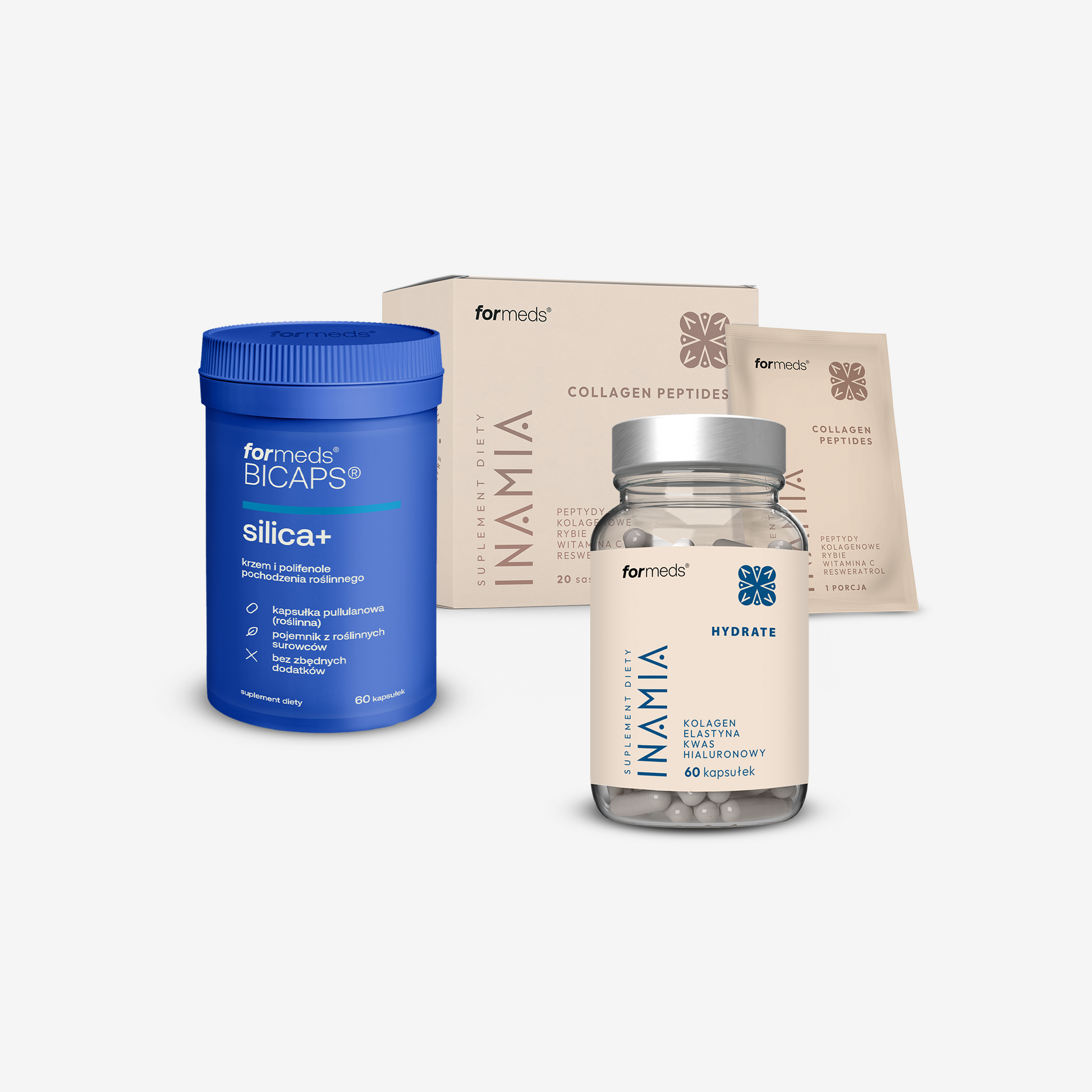 Zestaw 3 produktów: INAMIA collagen peptide, BICAPS silica+ oraz INAMIA hydrate, stworzony z myślą o kompleksowym wsparciu skóry - od elastyczności i nawodnienia, po naturalny blask i strukturę.